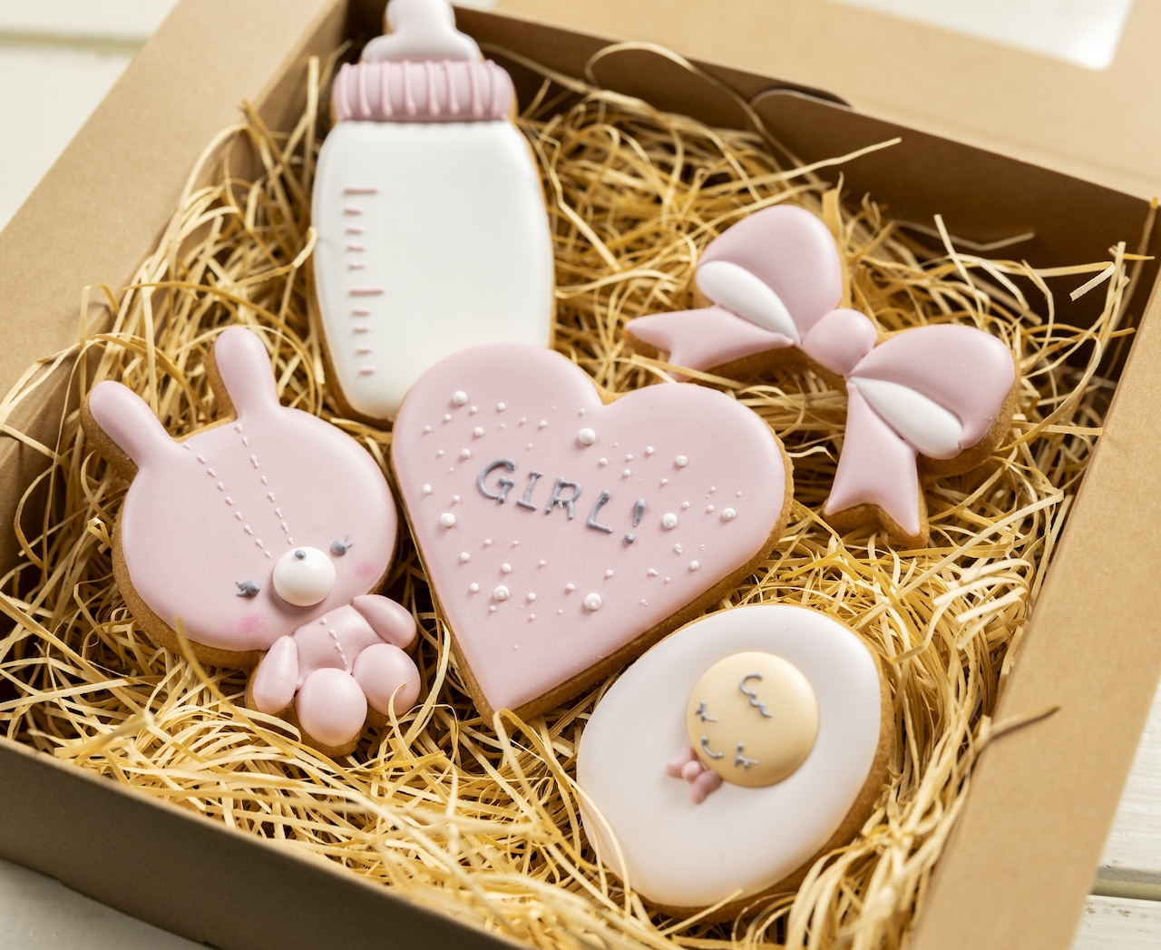 男の子か女の子か、どちらかを選んでいただき、その性別に合わせたデザインのクッキーをご用意いたします。箱の外からは中が見えないようにラッピングしているので、サプライズにぴったりです。家族や友人との特別な瞬間におすすめのセットです。